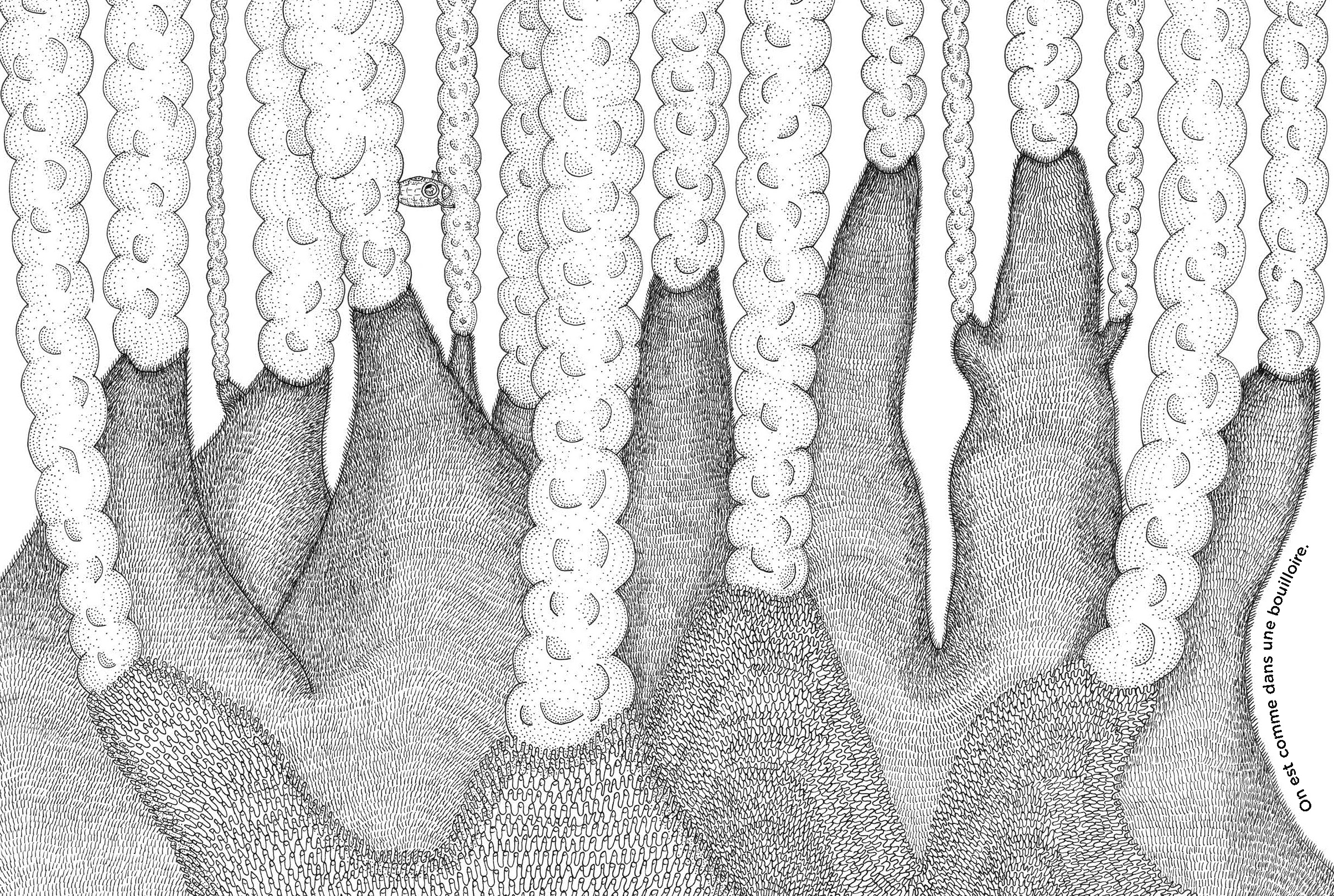 • Au fil d’un court récit poétique et de magnifiques planches à l’encre de chine, les jeunes lecteur·trice·s sont plongés dans l’inconnu, le mystérieux, l’invisible ou le peu visible et prennent conscience de la diversité de l’environnement marin, de sa richesse et de sa beauté fragile.