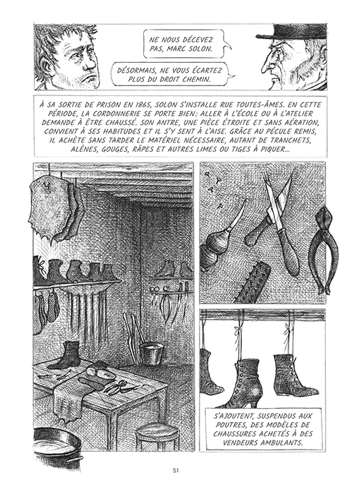 Élisabeth Voyame signe un texte à la fois minimaliste et brûlant – car reflet fictionnel de trajectoires authentiques – faisant se consumer les lecteurs, et de dessins en phase avec l’époque. Le récit n’est pas linéaire. L’album s’ouvre en 1855, dote de la première condamnation et se referme ou milieu des années 1890, mois, régulièrement, des épisodes de son enfonce et des moments correspondant à l’adolescence, voire à la vie de jeune adulte sont enchâssés dons la trame de l’album. Ces flashback, habilement mis en scène, per-mettent soit de créer du suspense, soit d’éclairer une séquence de la vie de Marc Solon, soit encore de poser sons en avoir l’air des questions sur le déroulé d’une vie et le déterminisme social.
