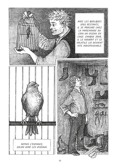 Dessinée à l’encre de Chine et au petit Rotring, la BD prend des allures de gravures de l’époque, qui collent bien au récit. Élisabeth Voyame avoue qu’elle aimerait beaucoup continuer dans cette voie, illustrer le livre d’un autre, ou faire une BD sur son propre scénario. C’est tout le mal qu’on lui souhaite. Grâce à Solon, qui n’est jamais parvenu à changer de vie, Élisabeth Voyame en a peut-être trouvé une nouvelle.